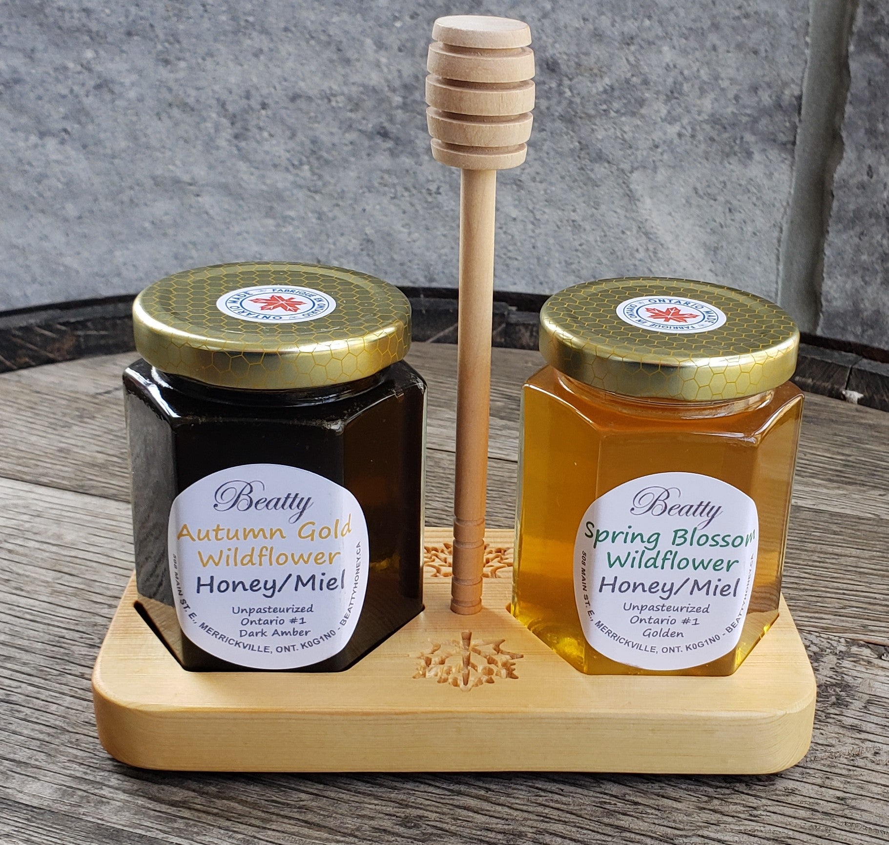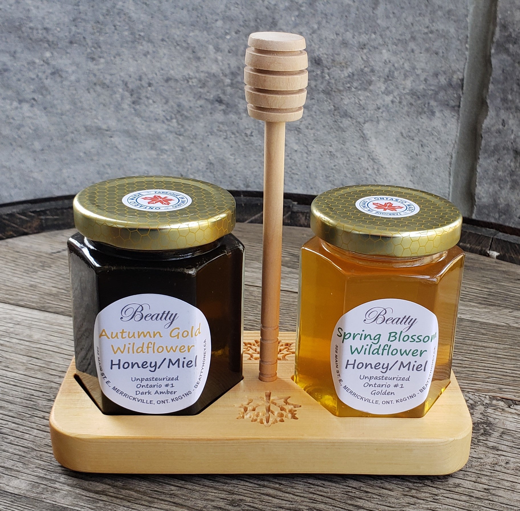 Wood honey boats are paired with two options of Spring Blossom, Summer Wildflower, or Autumn Gold honey. Of course, all are our 100% Ontario unpasteurized wildflower honey in the attractive hexagonal jar.
